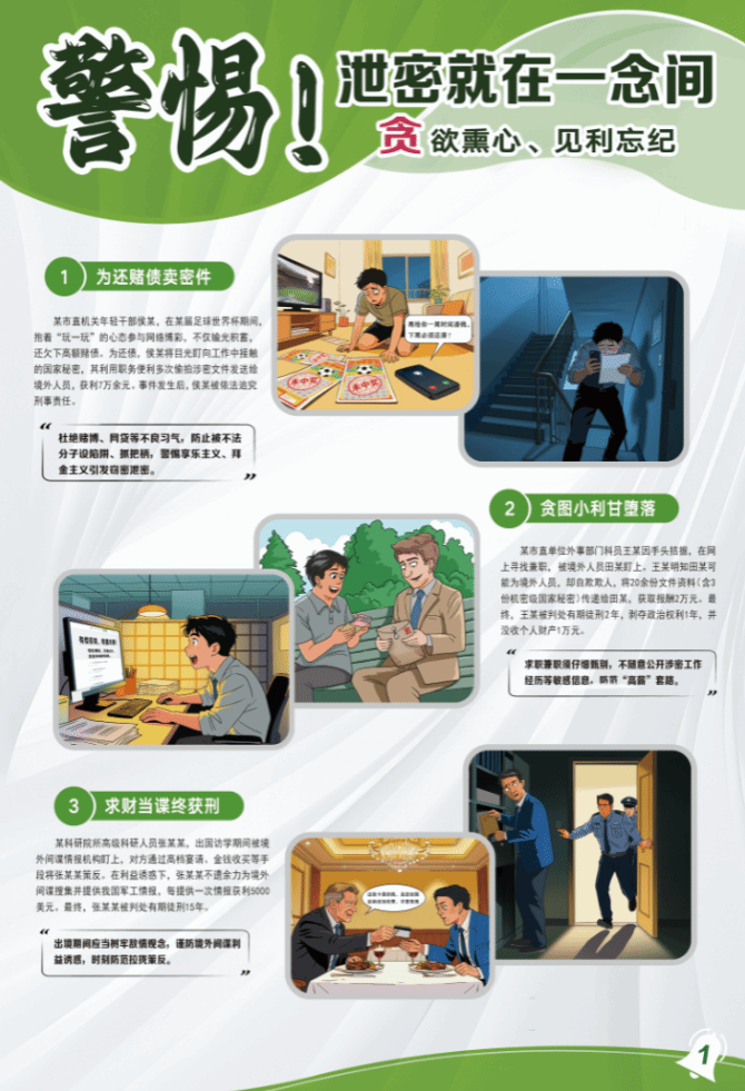 解析泄密案件背后的思想根源,聚焦贪念、惰念、怨念、私念四种不良心态,介绍典型泄密案例并作出保密提醒,引导干部职工筑牢思想防线,杜绝因一念之差导致国家秘密泄露。
